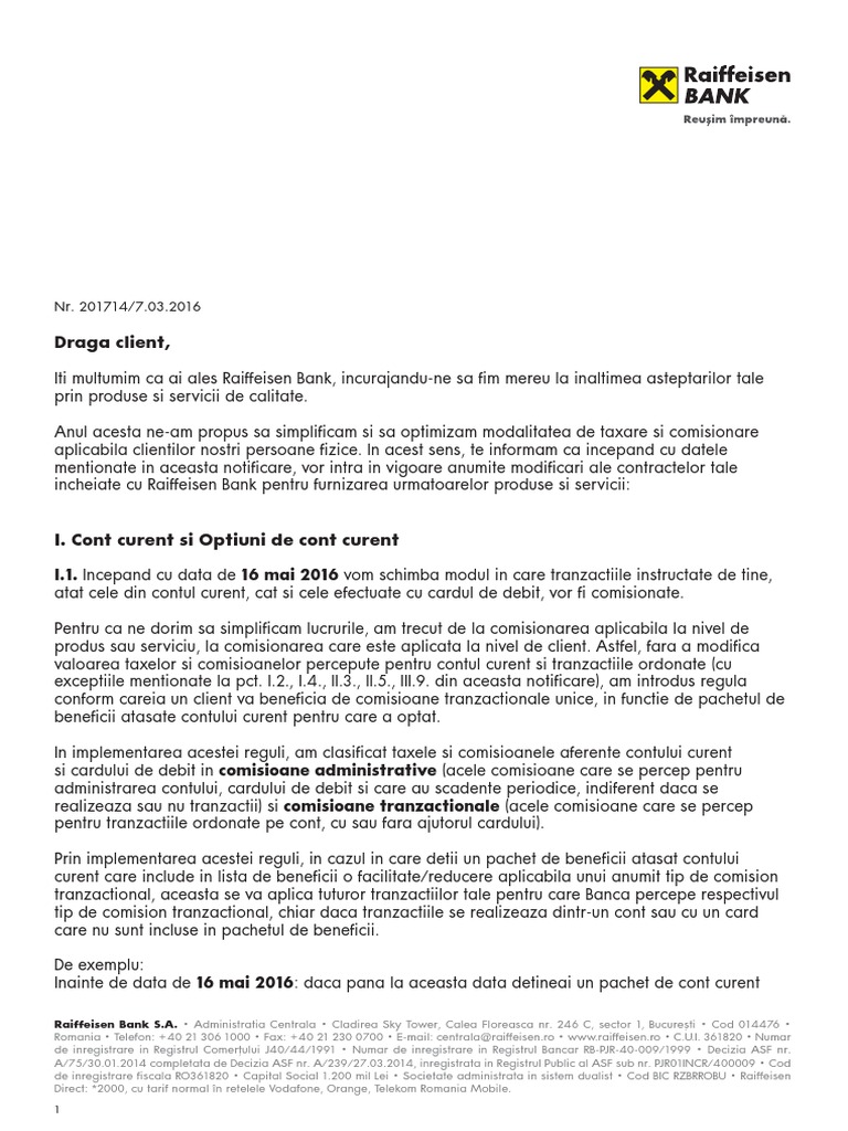 În privinţa raiffeisen, creditul de la banca austriacă include un comision de acordare aflat între 0,75% şi 1%, comision de administrare între 0,16% şi 0,25% pe. Institutie cu raiffeisen bank a introdus noi pachete de cont curent cu costuri zero, dedicate persoanelor care unele banci incearca sa atraga consumatorii prin credite fara comisioane, pentru a semnala ca nu exista costuri ascunse. Principiul care a stat la baza acestor modificari este acela de a incuraja de asemenea, grila de comisioane pentru operatiunile prin ordin de plata este mult simplificata prin inlocuirea celor cinci transe existente in acest moment cu.